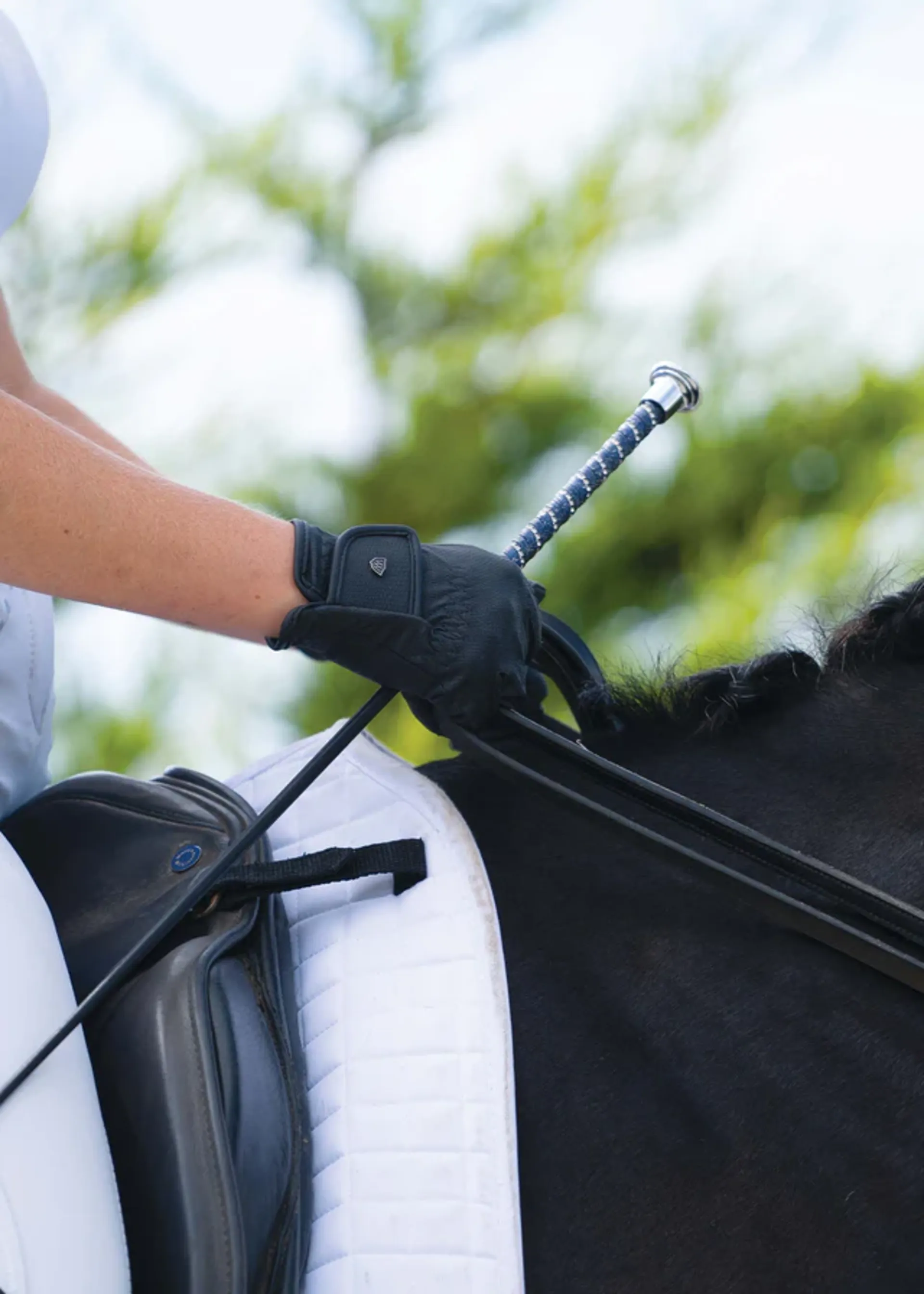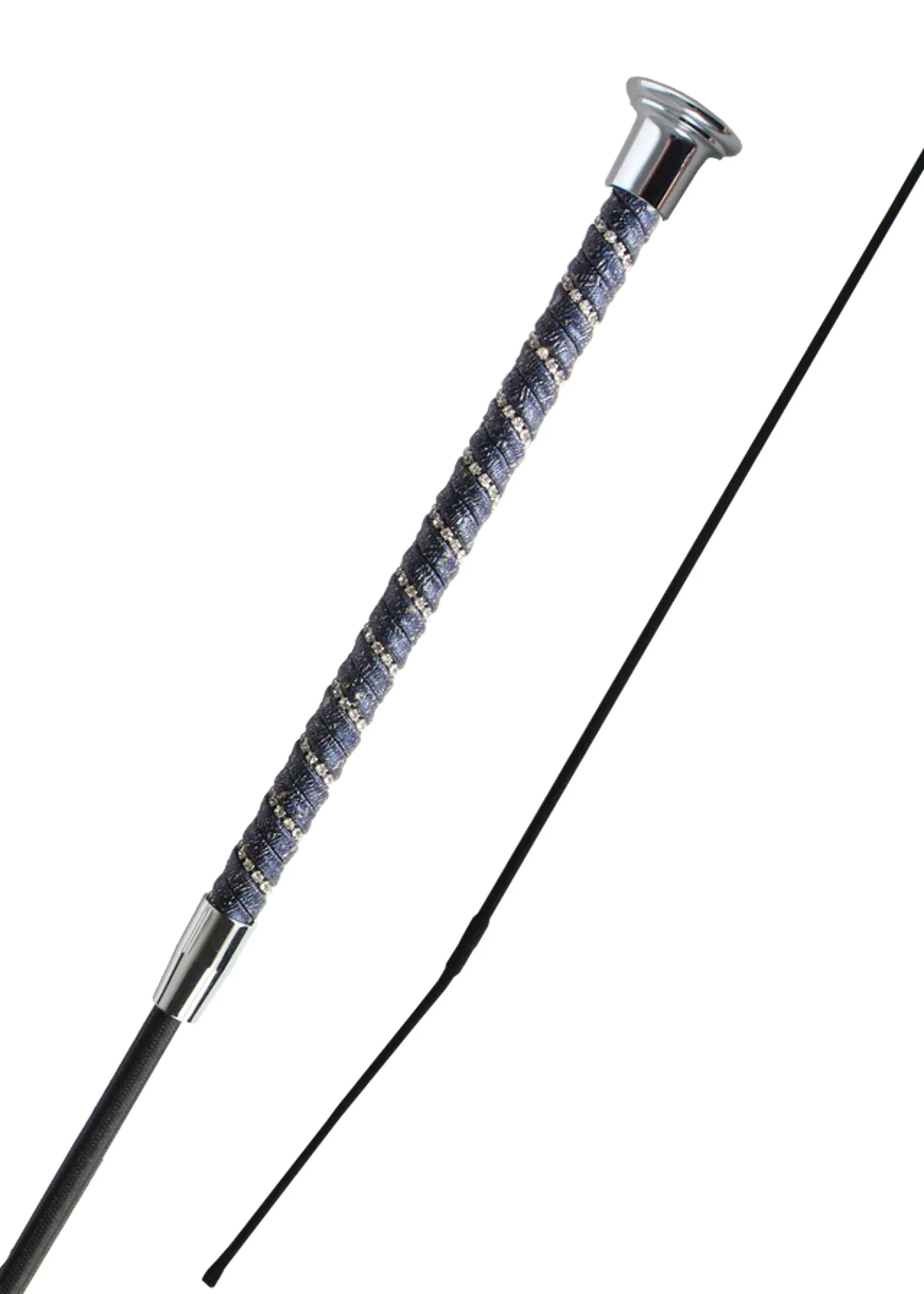 Woof Wear’s Twisted Dressage Whip in Navy offers a refined combination of elegance and performance. Its slim, ergonomic grip is beautifully twisted with shimmering Silver crystals, providing both visual impact and comfortable handling.