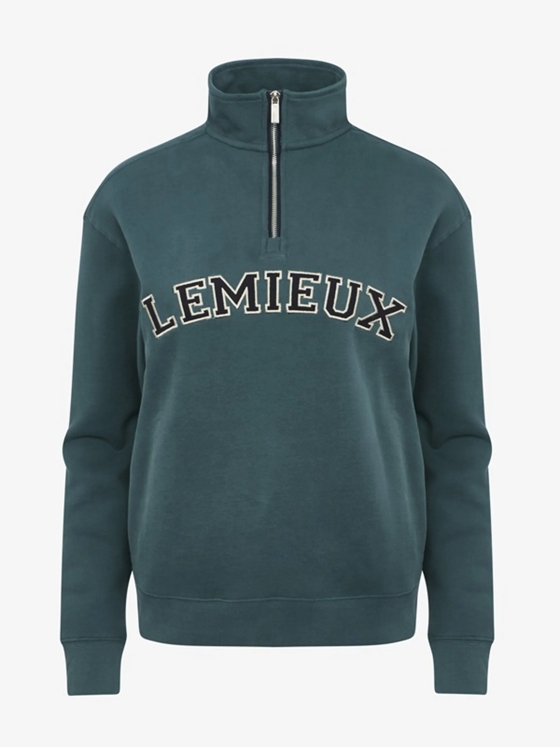 Nail the varsity trend in this college-style quarter zip sweat with retro embroidered LeMieux branding. A soft and luxurious sweat in brushed back jersey with self collar, cuff and hem, it features a chunky zip with LeMieux branded puller, side entry pockets and slightly looser fit sleeves for a slouchy vibe.