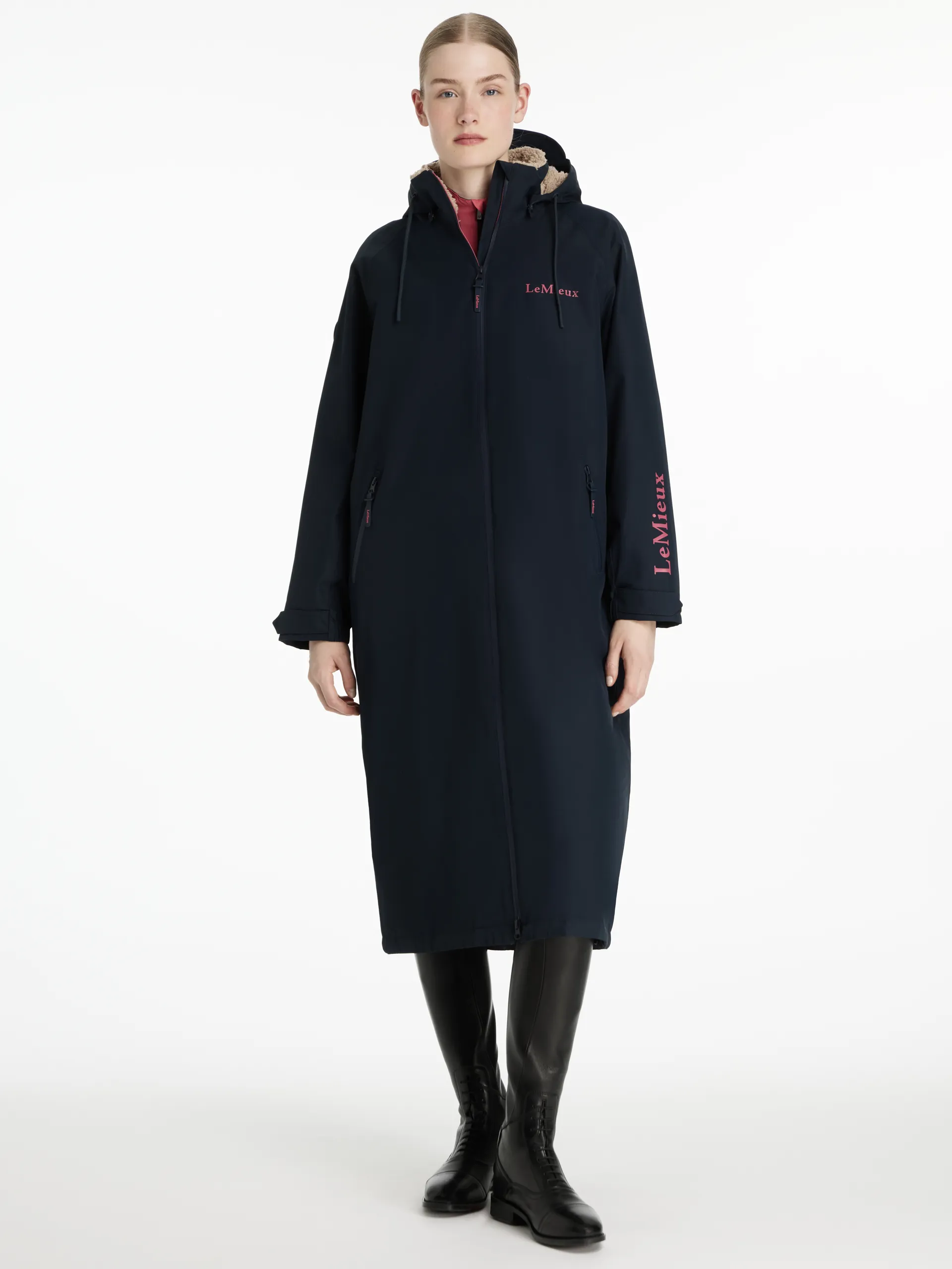 Shelter from the storm in this full-length, oversized, waterproof coat with a moisture-wicking fleece lining. Perfect for riding, changing and even running errands, it's big enough to throw on over clothing and cosy enough to dry off in. It's waterproof to 12,000mm with fully welded seams, inner storm cuffs, and a detachable hood. The breathable fabric has a 10,000mvp rating - ideal for working hard without overheating. There's plenty of pocket space for warming your hands and stashing treats in the deep zipped pockets. A two-way front zip gives you flexibility, while the back hem vent allows for fitting over the saddle. The PFC-free outer fabric is durable and ideal for life with horses. With statement LeMieux branding print and all the finishing touches you expect from LeMieux, this is the best way to stay dry - or dry off - on a wet ride.