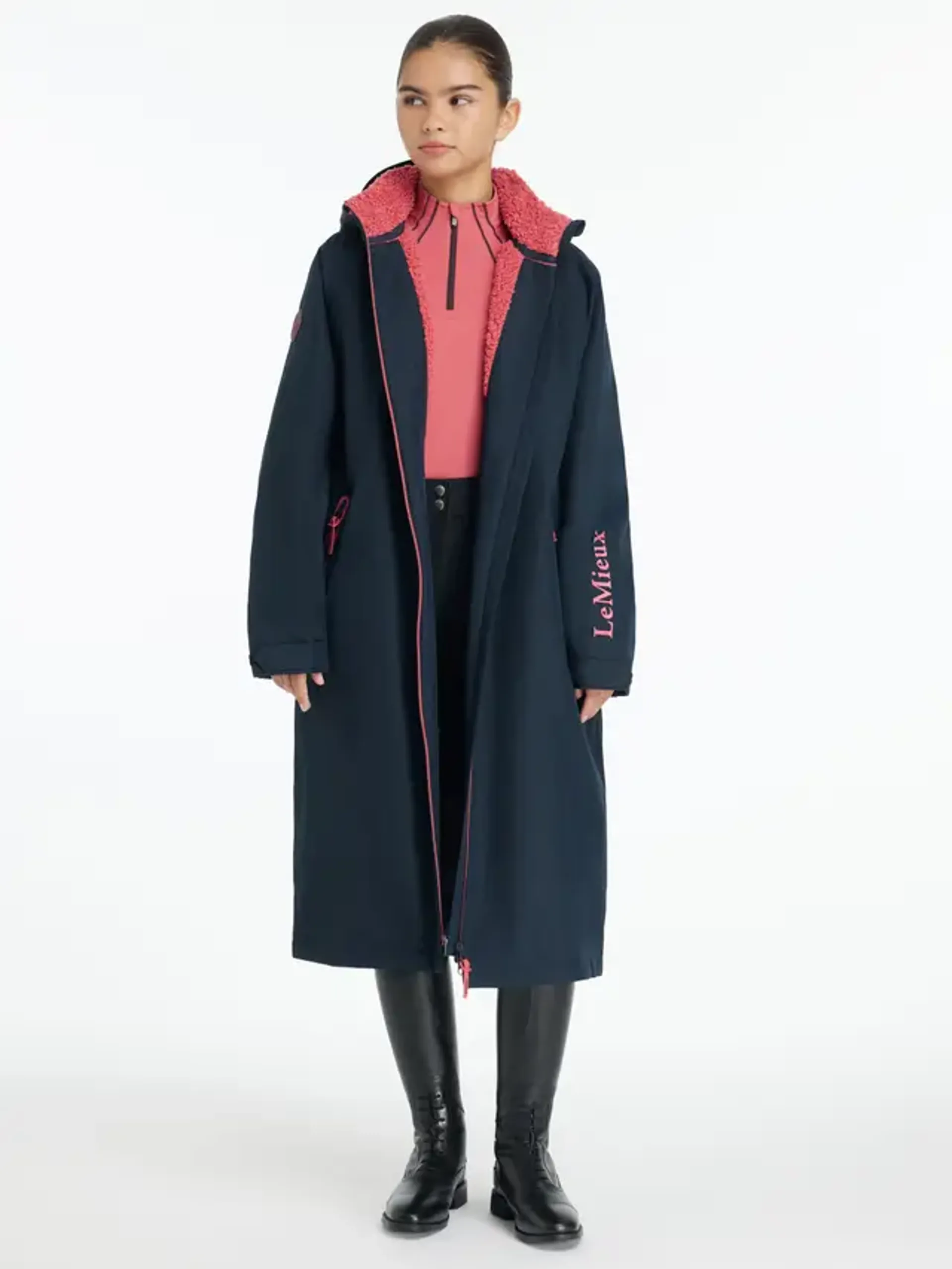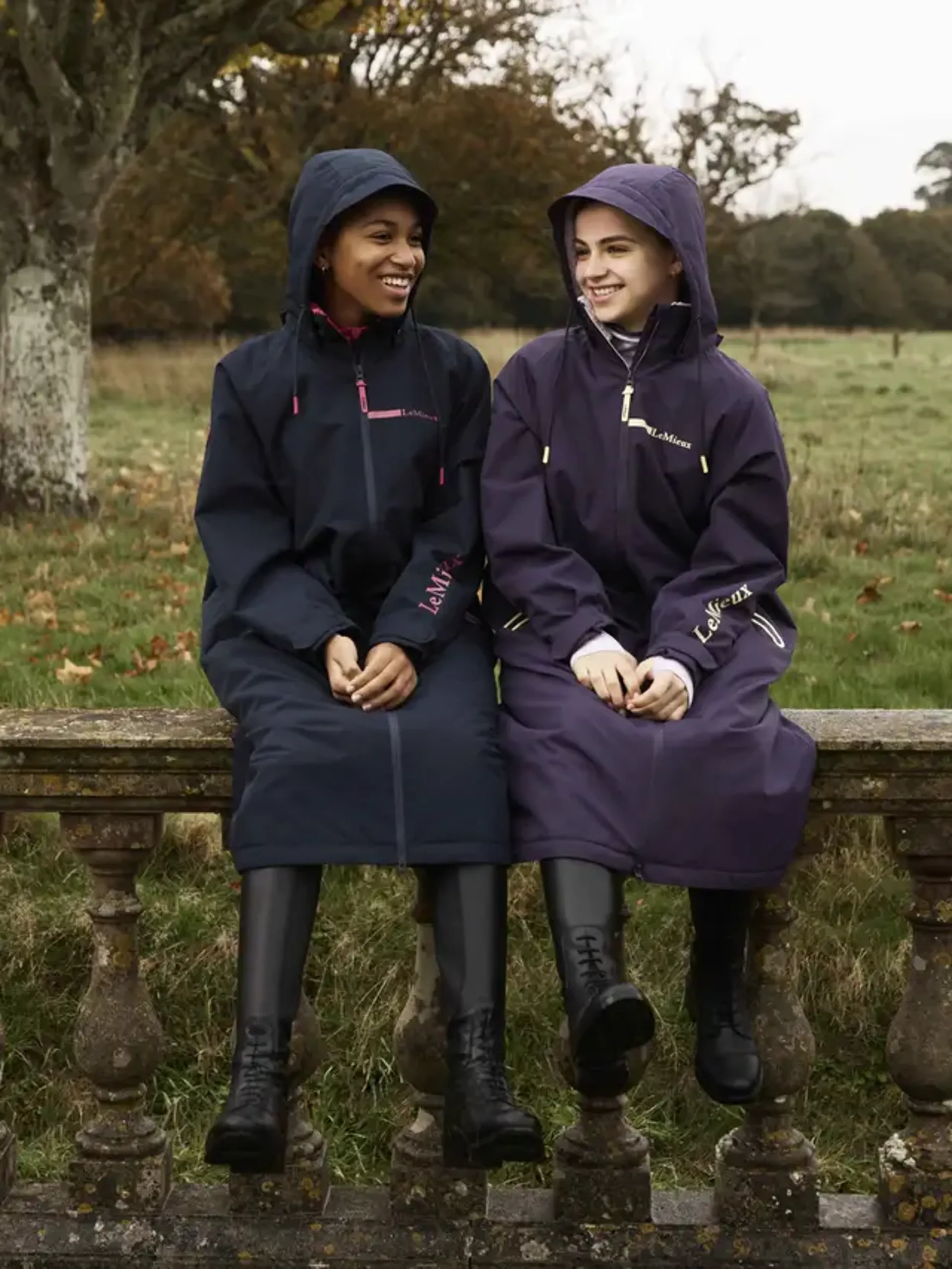 Shelter from the storm in this full-length, oversized, waterproof coat with a moisture-wicking fleece lining. Perfect for riding, changing and even running errands, it's big enough to throw on over clothing and cosy enough to dry off in. It's waterproof to 12,000mm with fully welded seams, inner storm cuffs, and a detachable hood. The breathable fabric has a 10,000mvp rating - ideal for working hard without overheating. There's plenty of pocket space for warming your hands and stashing treats in the deep zipped pockets. A two-way front zip gives you flexibility, while the back hem vent allows for fitting over the saddle. The PFC-free outer fabric is durable and ideal for life with horses. With statement LeMieux branding print and all the finishing touches you expect from LeMieux, this is the best way to stay dry - or dry off - on a wet ride.