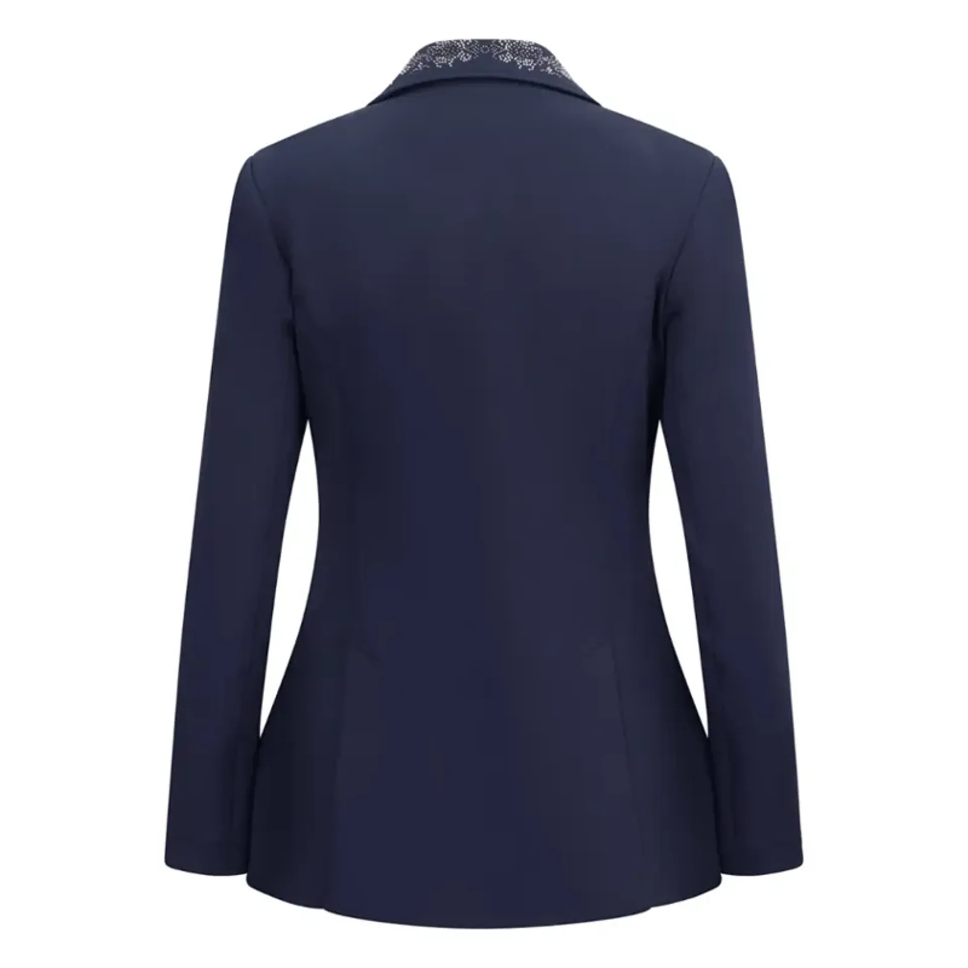 This jacket is made from a showerproof stretch jersey fabric, ensuring both comfort and protection against the elements, so you stay dry and comfortable even in unpredictable seasonal weather. Its stretch quality allows for excellent freedom of movement, which is essential during riding. What sets this jacket apart is its exquisite design details. The crystal collar embellishment adds a touch of elegance and sophistication, making it stand out in the show ring. The contrast zip pockets are not only practical for securely holding small items but also add a modern, stylish flair to the overall design. The jacket also features double back vents, for a better silhouette in the saddle and provide ease of movement, making it ideal for active competition. Inside, the jacket is lined with a mesh material, which contributes to its breathability and comfort. The mesh lining ensures that you remain cool and dry by allowing airflow and wicking moisture away from your body. This feature is particularly important when riding for extended periods.