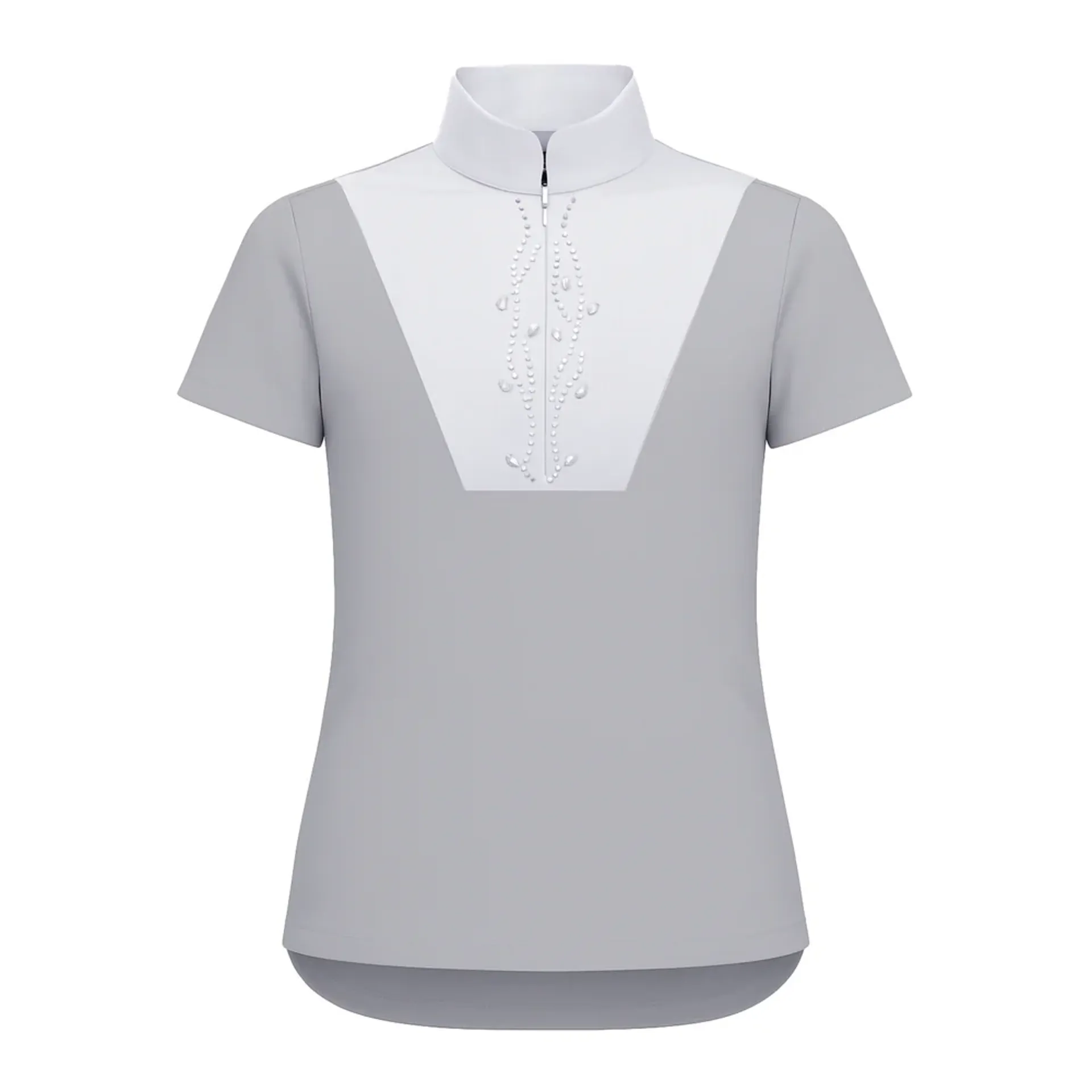 The shirt's distinctive design includes a white contrast bib, adding a traditional competition look with a twist. Delicate crystal embellishments adorn the bib in an elegant pattern, catching the light as you move and giving just the right amount of sparkle for the show ring. This subtle touch of glamour ensures the Junior Virginia Shirt stands out while still adhering to the smart, professional image required in competition settings.