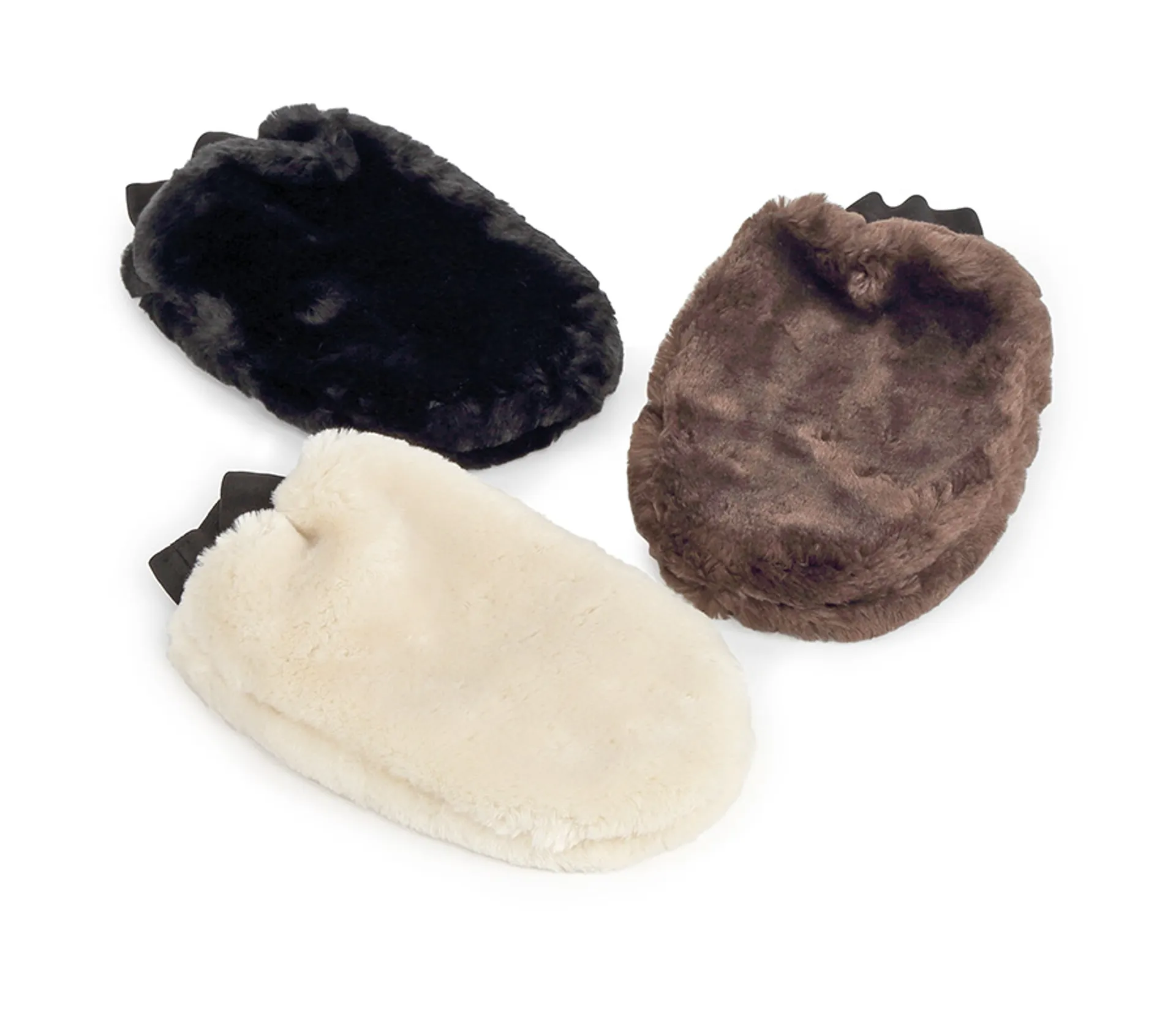 Shires SupaFleece grooming mitt.  Machine washable alternative to sheepskin that feels like the real thing! Get your horse's coat super shiney with this gorgeous finishing mitt.