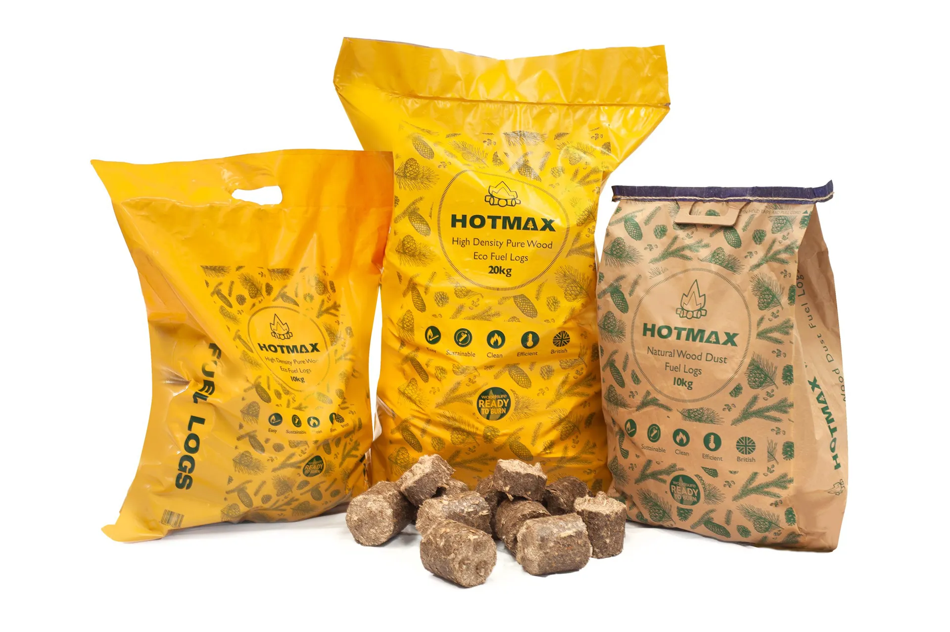 The Hotmax Briquettes are high density compacted heat logs are made from 100% natural, recycled wood dust. They’re denser, drier and burn cleaner than even the best kiln dried or seasoned hardwood logs. They're quick and easy to light and they give you high heat very fast with very low emissions and minimal ash residue.