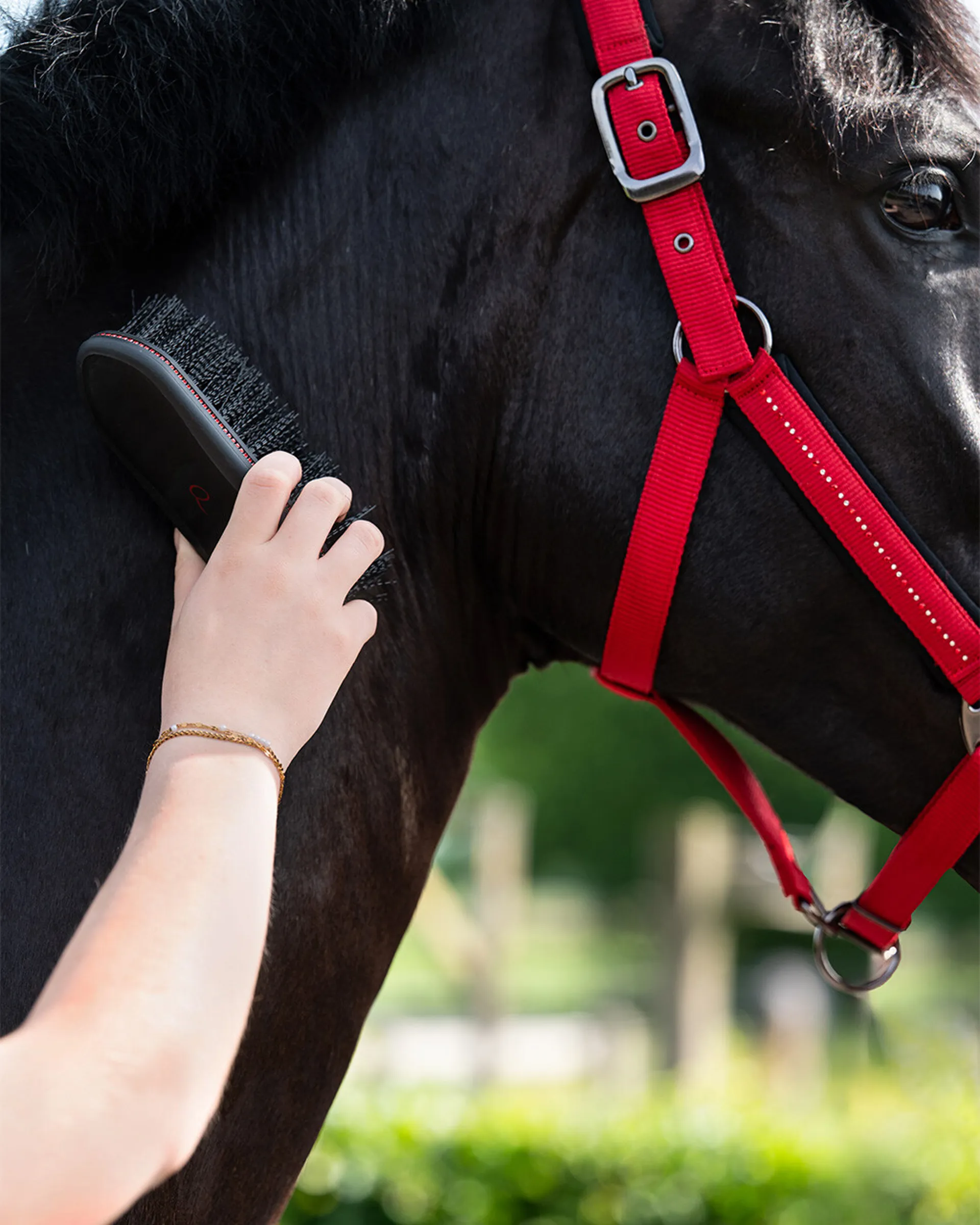 Dandy brush from the Oakleigh collection with black and red bristles, rhinestone details and Q-logo. Ideal for loosening dirt.