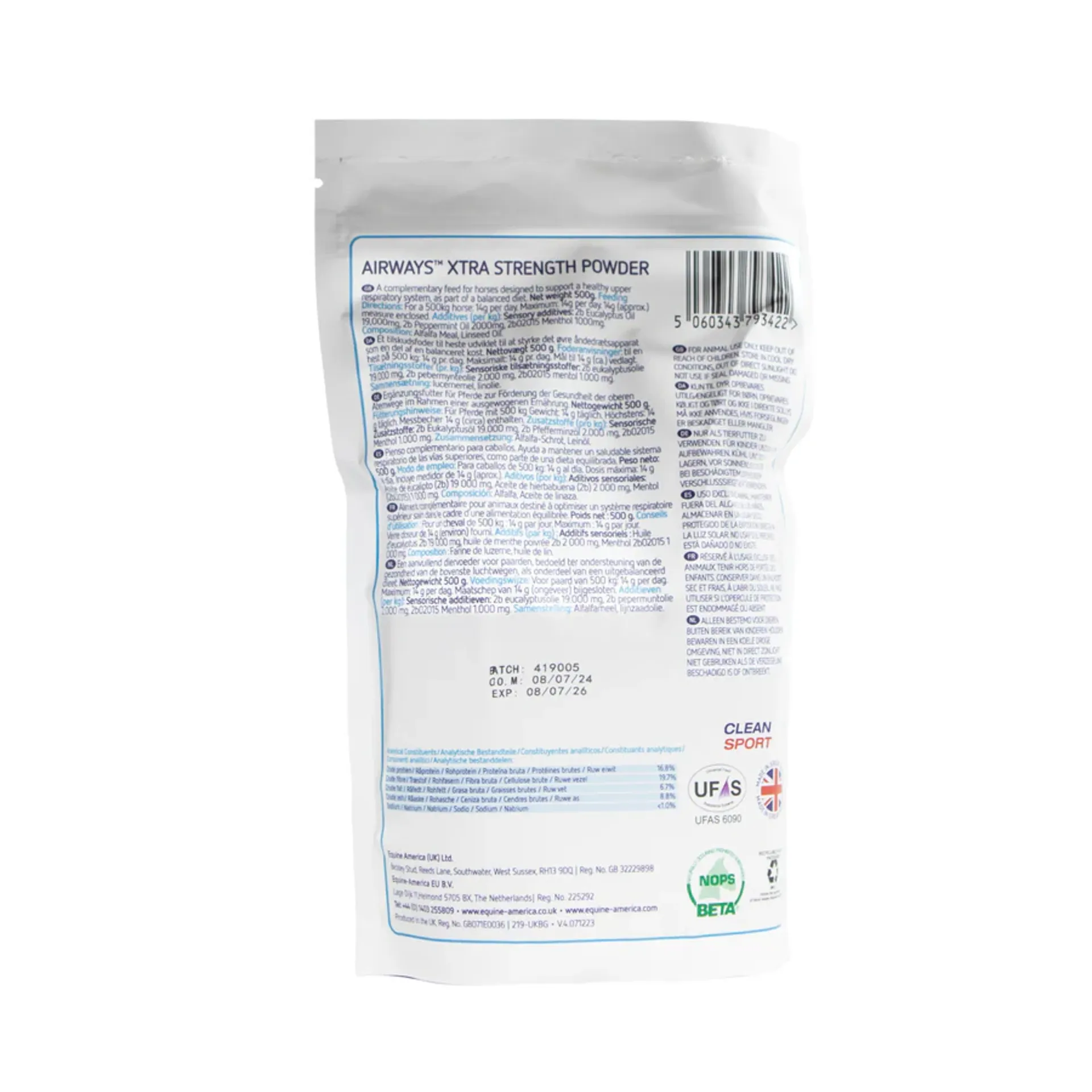 • Equine America is BETA NOPS and UFAS accredited, making Airways Xtra Strength Powder suitable for horses competing under FEI regulations and the Rules of Racing by reducing the risk of our products containing prohibited substances