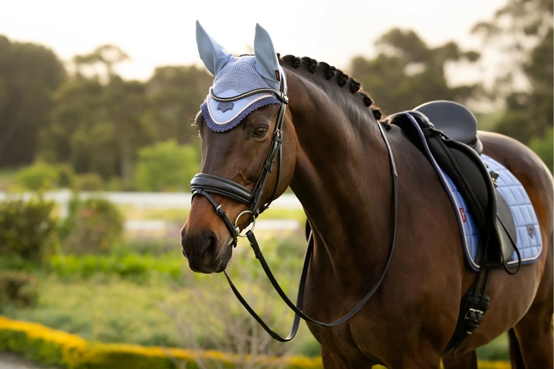 The veil is crafted in handmade 100% cotton crochet with four-way stretch for a secure fit under the bridle. It's edged with a decadent braid or cord trim. A stylish satin front piece features the signature LeMieux logo as a badge motif. The veil is complemented with soft, comfortable elastane ear fabric, designed to protect your horse's ears from flies, dust and distractions.