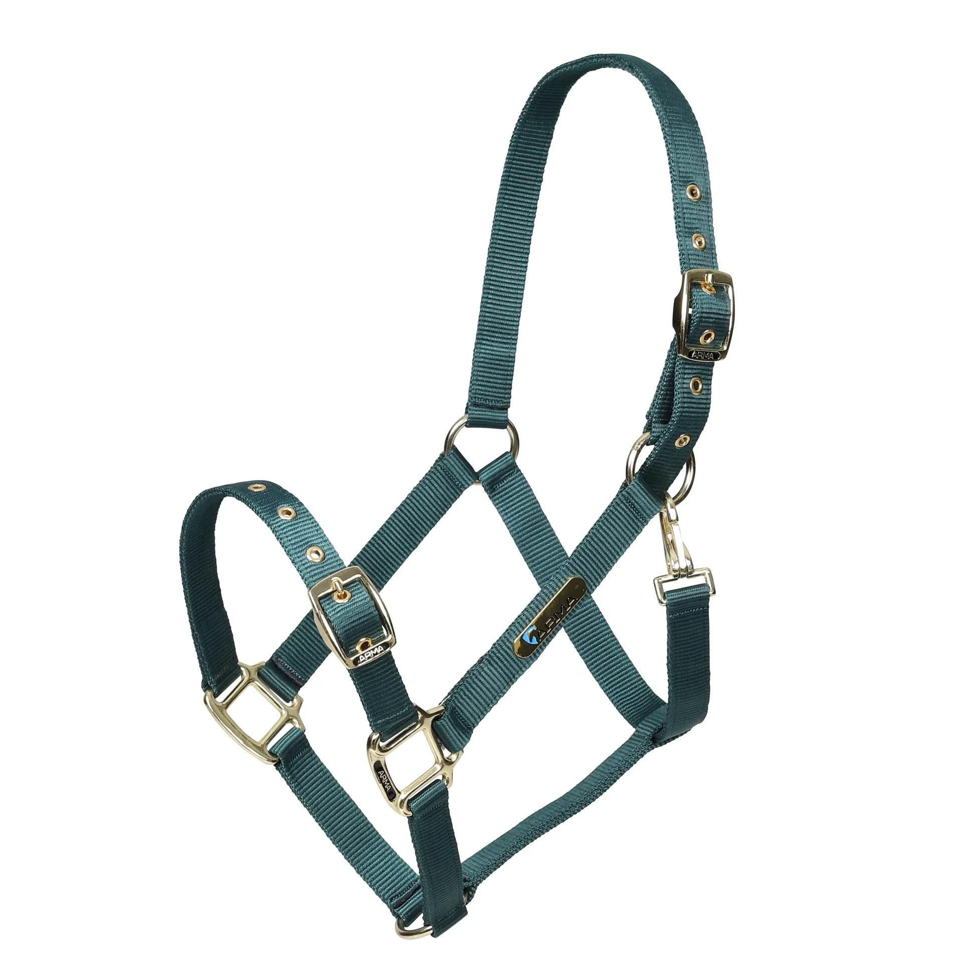 The ARMA adjustable headcollar benefits buckle fastenings at the head and nose and a convenient clip-on throatlash. Made with double layer durable polypropylene webbing and trimmed with high shine gold colour fittings and an ARMA plate.