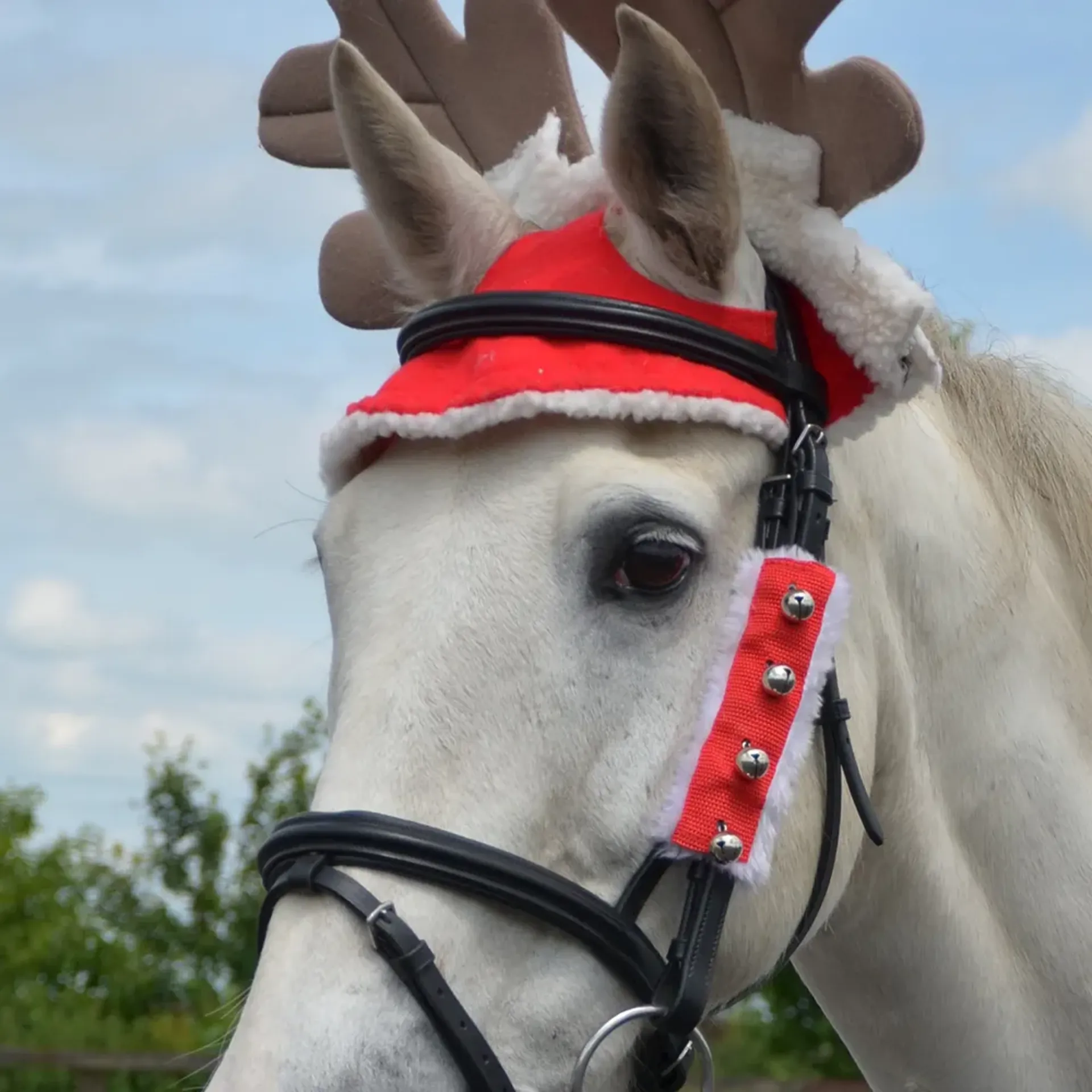 This festive bridle set comes with three decorative pieces, complete with four bells. Place the set on the brow band and nose band of your bridle. The quick to fit, touch tape design will accommodate a range of bridles – perfect for a Christmas photo.