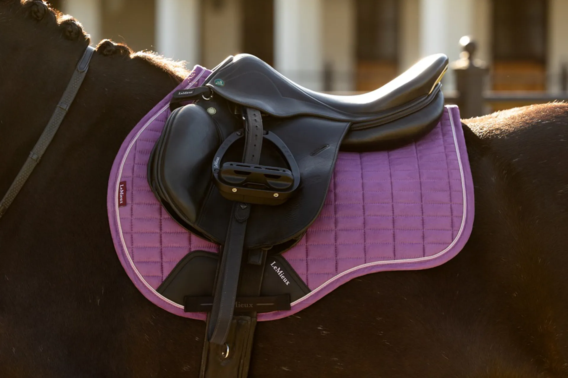 An iconic GP pad with its high wither cut, elasticated D-ring tabs and swept back profile, the LeMieux suede saddle pads offer practicality and comfort under the saddle.