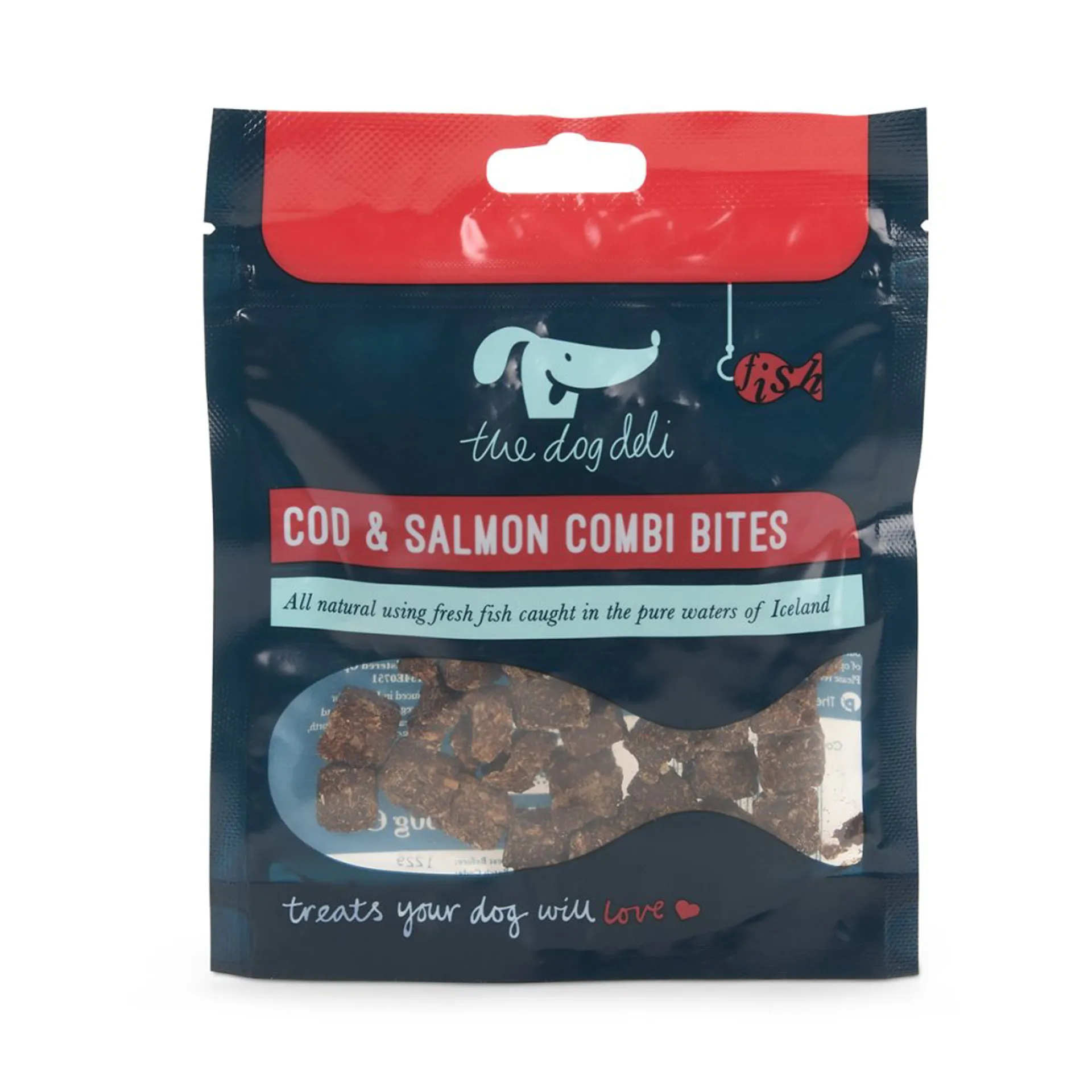 The Dog Deli Cod and Salmon Combi Bites are 100% natural fish treats from Iceland, perfect for dogs with sensitivities, promoting healthy skin, coat, teeth, and digestion.