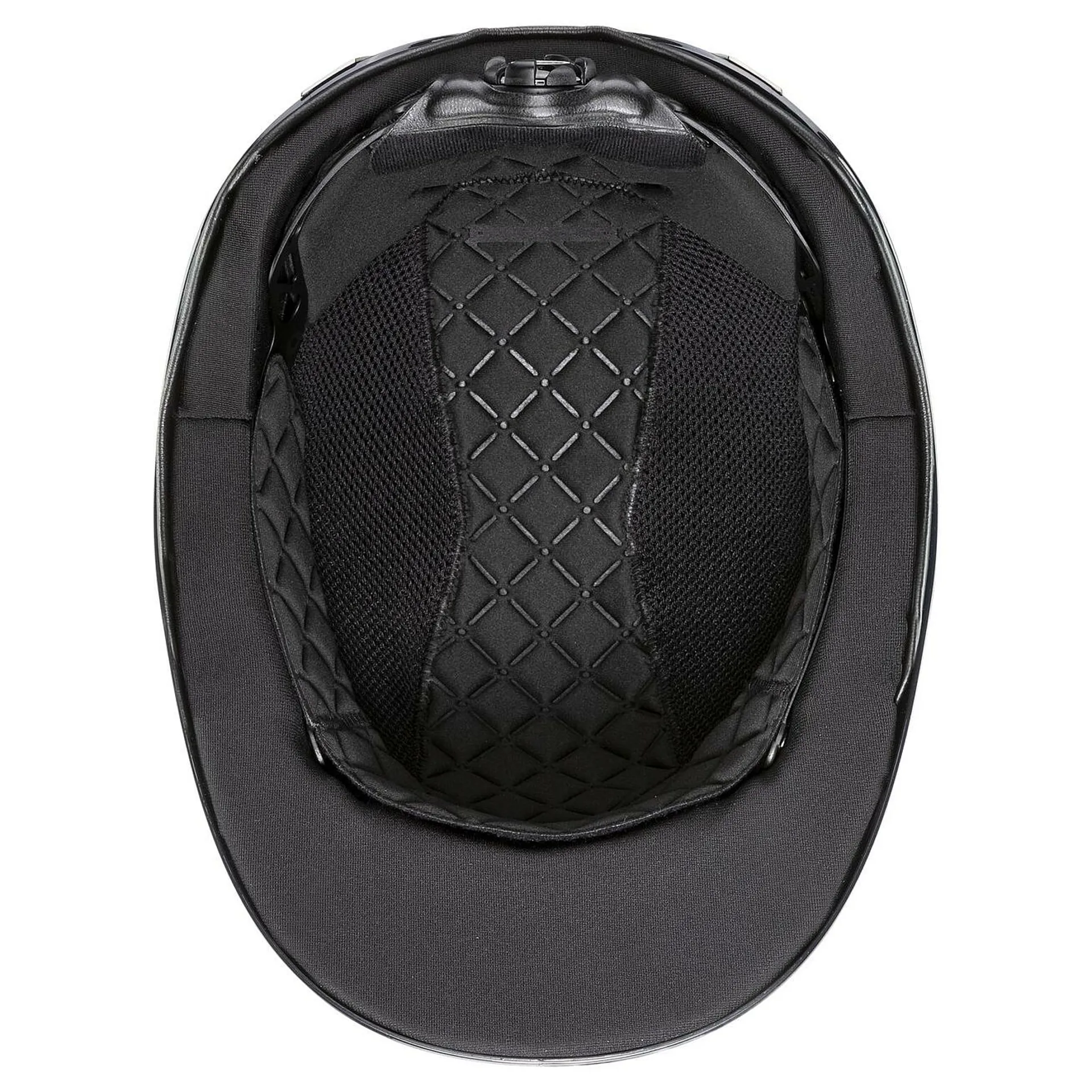 A striking high-gloss riding helmet with strong hardshell protection and precise 3D fit adjustment. Comfortable, secure and finished with premium faux leather straps for a smart, modern look.