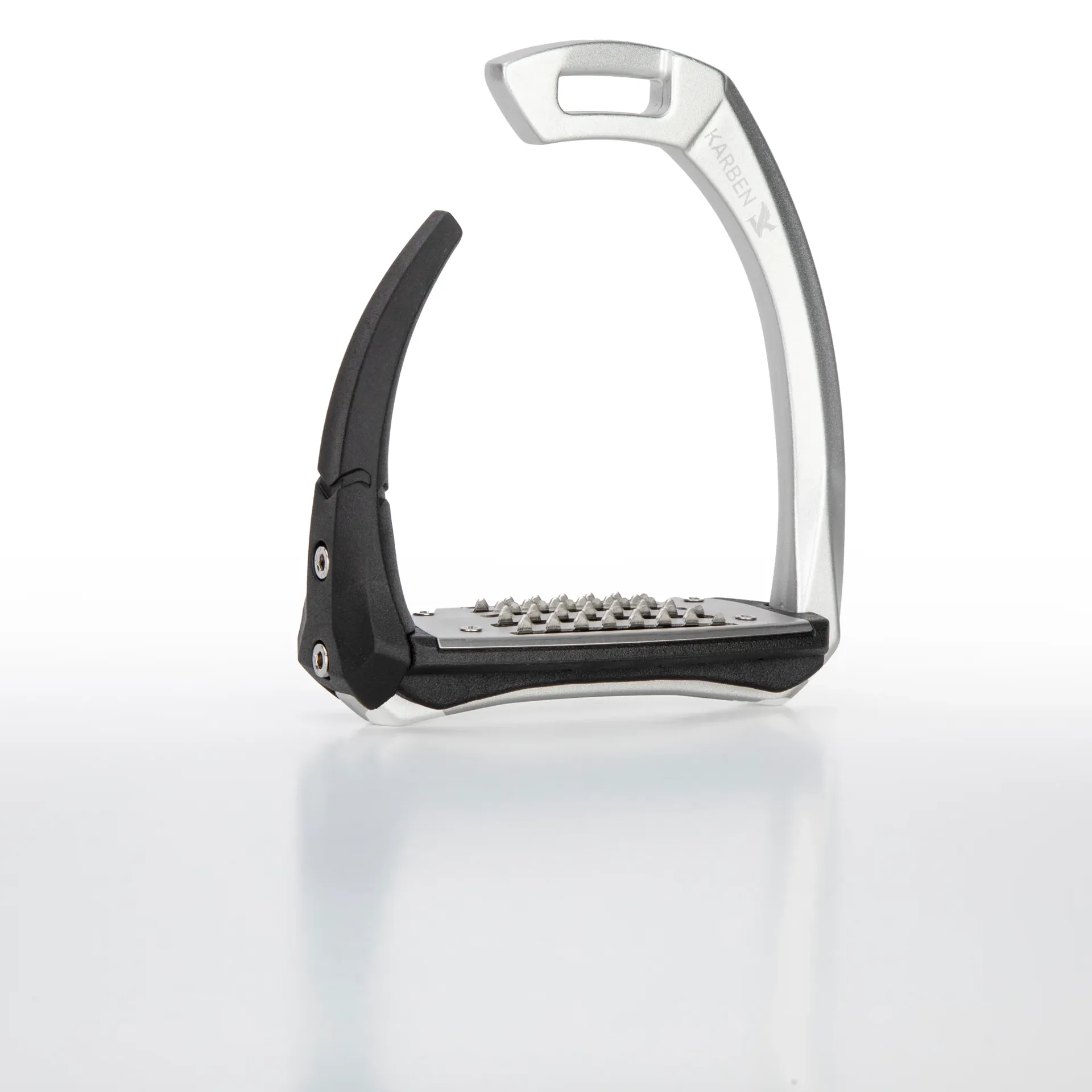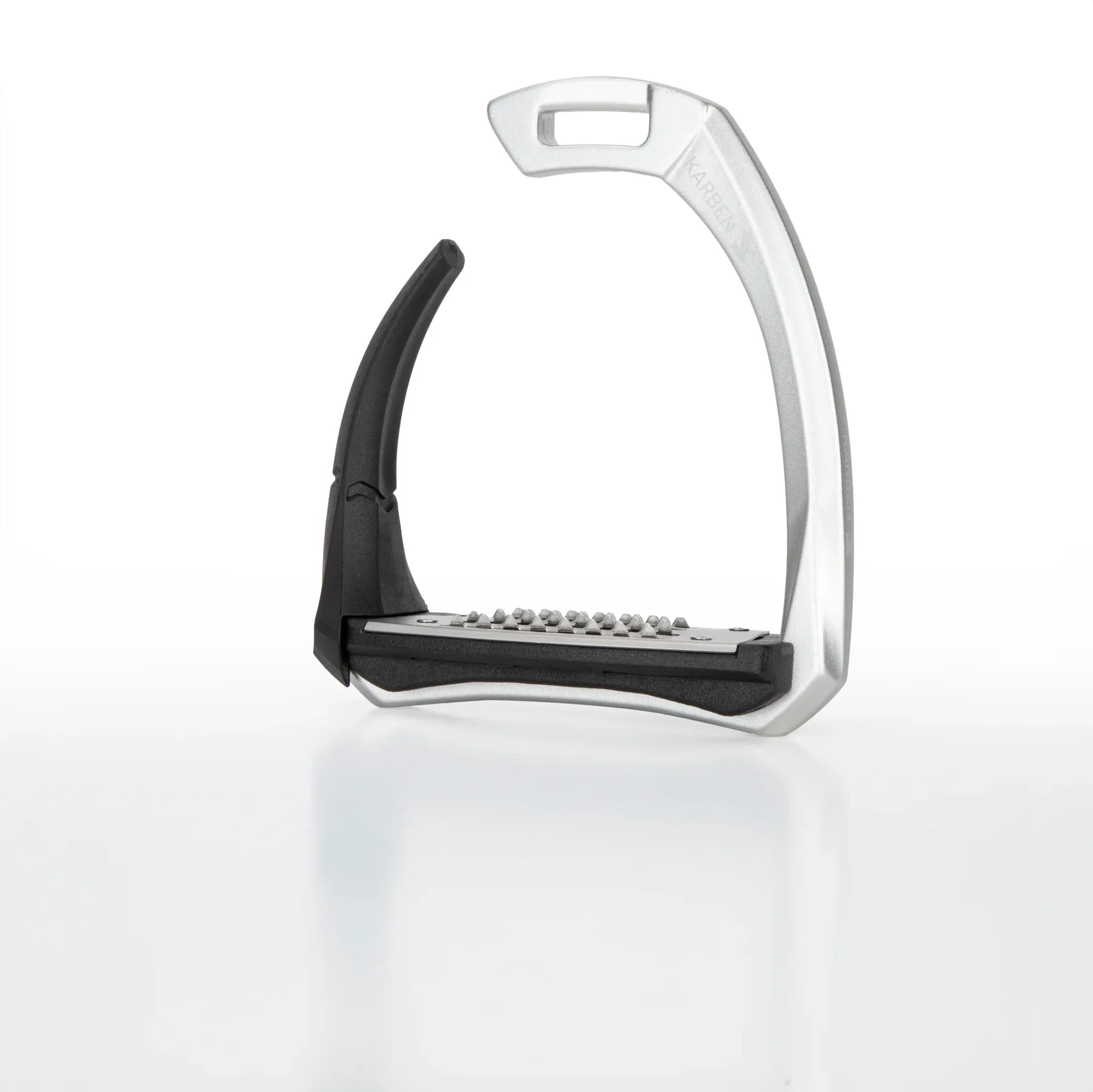 Thoughtfully proportioned and carefully balanced, the Karben Ultra Grip FX Stirrup combines attractive aesthetics with reassuring safety benefits. Retaining form under normal circumstance, in the event of a fall the outer safety arm flexes under pressure, allowing escape of the foot and reducing incidence of serious injury to the rider. Following release, the rubber arm retains its original shape and purpose as a supportive lateral arm.