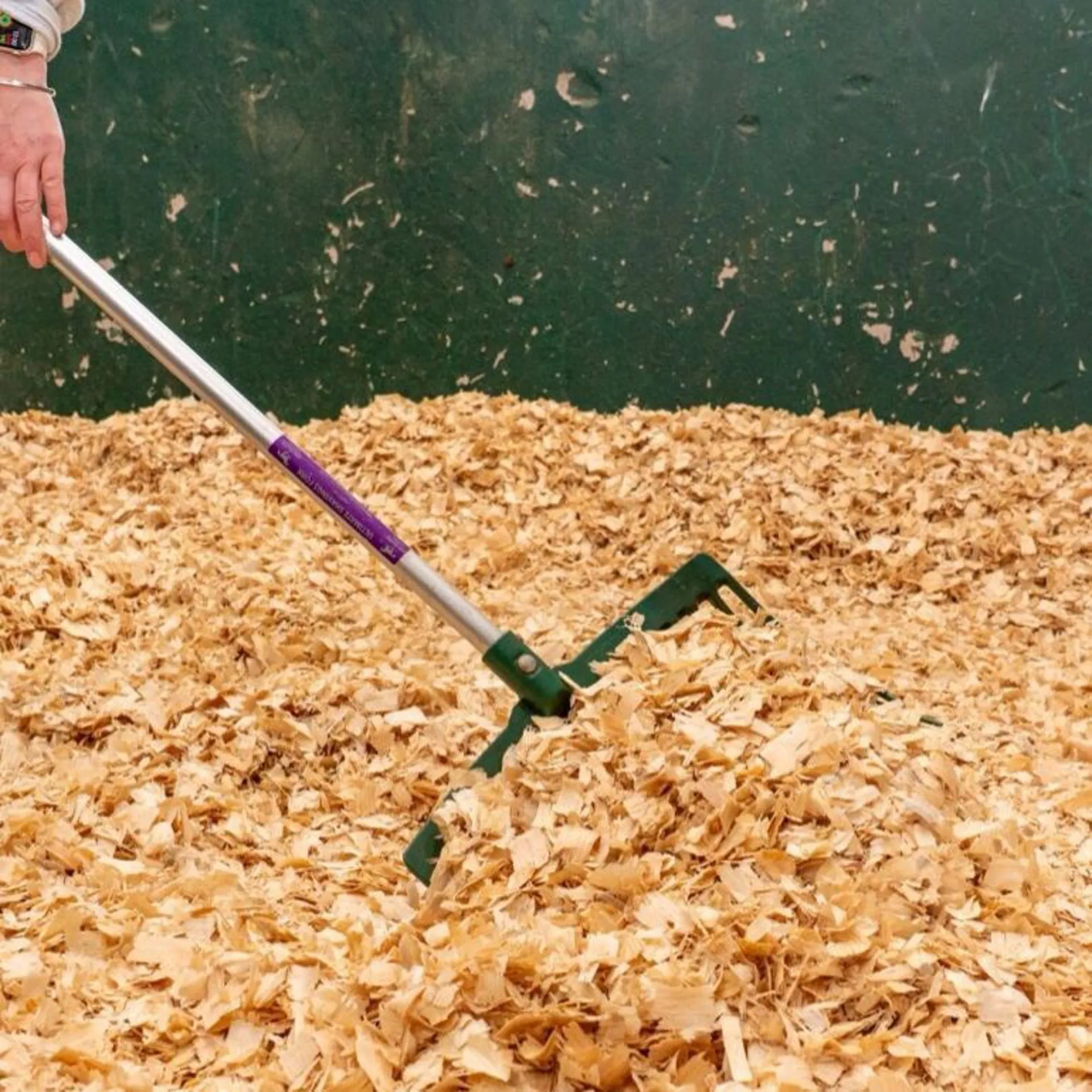 Shake the fork gently to allow clean shavings to fall back onto the bed and minimise waste, then loosen the surface and remove any dirty or wet bedding underneath, banking clean shavings to one side to reduce wastage.