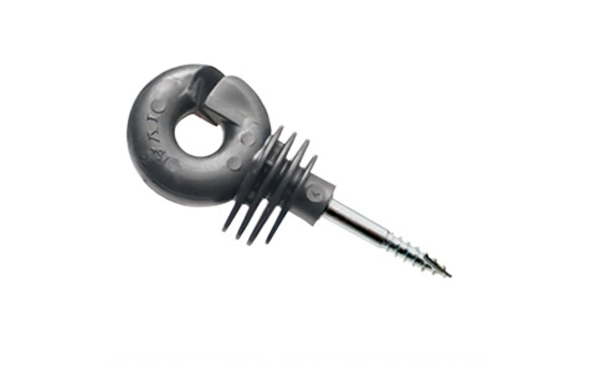 insulated screw-in ring for electric fences. Keeps tape, rope or wire securely attached to posts while preventing power leakage. Durable plastic with metal screw, weather-resistant.